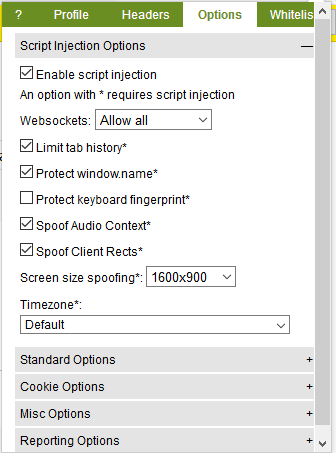 This option enables script injection. Script injection is required if you want to use some of the features in this tab such as disabling WebSockets, spoofing your screen size, and your browser fingerprint.